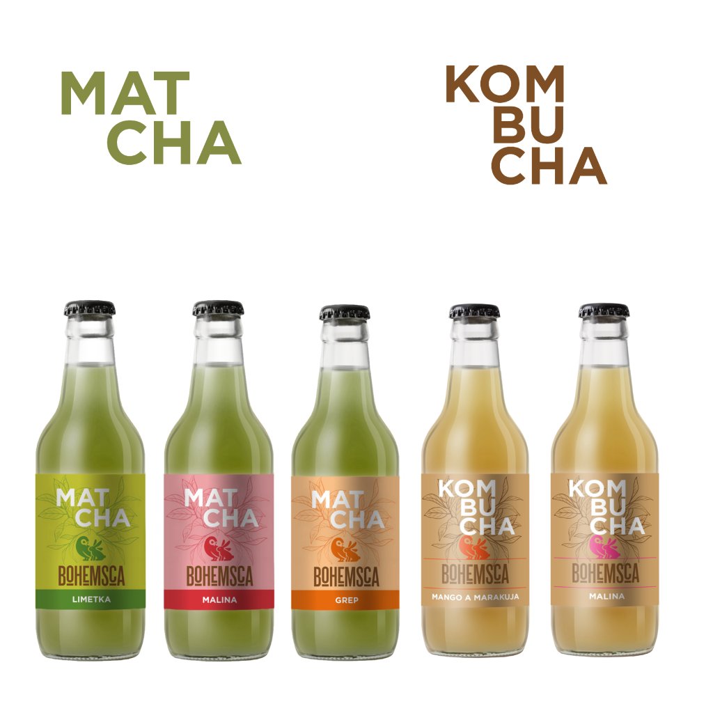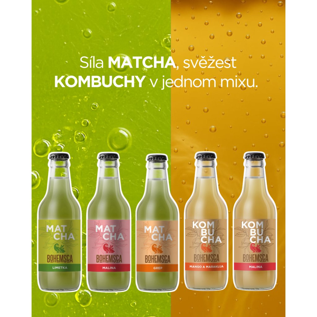 Objevte BOHEMSCA trendy drinky MATCHA a KOMBUCHA v mix balení. Vyzkoušejte od každé z 5ti příchutí.